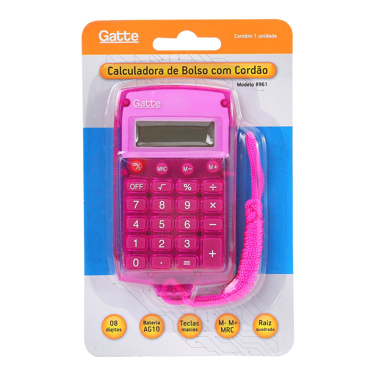 CALCULADORA – 8 DIGITOS c/ Cordão (8961) NO BEEP SOUND Emborrachada 100x58x9 – Bateria – Rosa