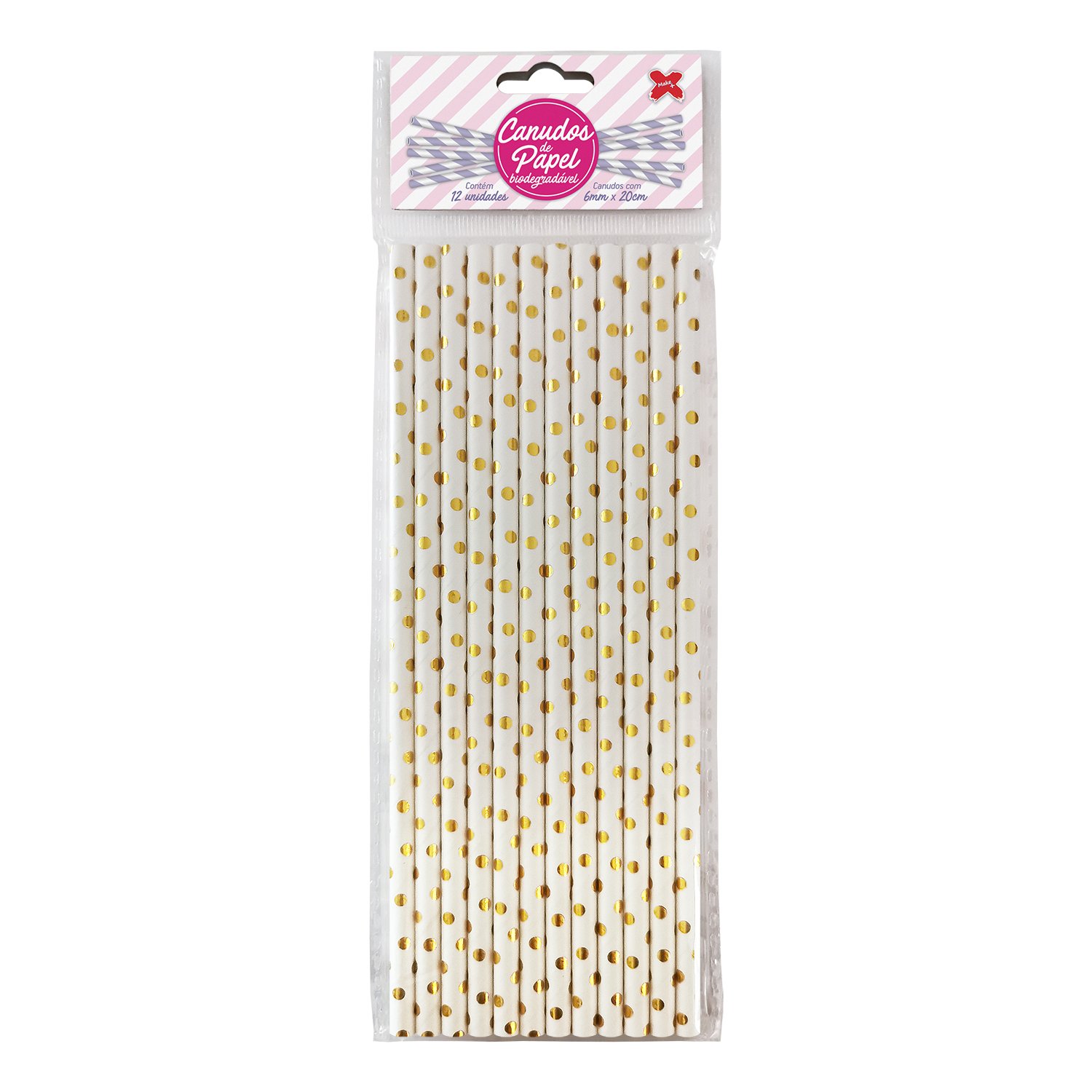 Canudo de Papel 6mmx200mm c/ 12 und – Branco e Ouro – Bolinhas